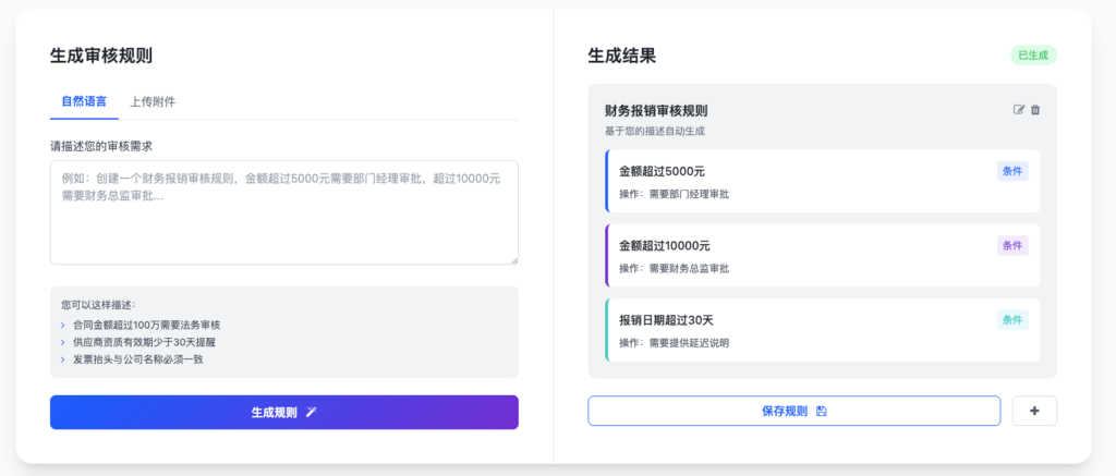 - 自然语言生成:顺利获得日常语言描述审核需求,自动解析为含触发条件、逻辑、风险等级的标准规则;